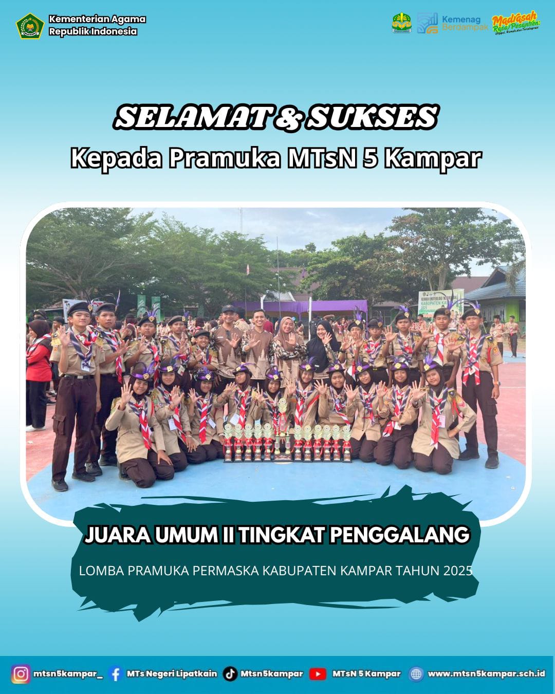 Bangkinang - Pangkalan Pramuka MTsN 5 Kampar berhasil meraih Juara Umum II Tingkat Penggalang dalam Perkemahan Ekoteologi Madrasah Kabupaten Kampar (Permaska) Tahun 2025 yang berlokasi di bumi perkemahan MAN 2 Kampar setelah mendapatkan 11 juara dari 15 jenis perlombaan yang telah diikuti. Kegiatan tersebut berlangsung mulai dari tanggal 7-9 November 2025. Kegiatan ini diikuti oleh 25 pangkalan madrasah se-Kabupaten Kampar.